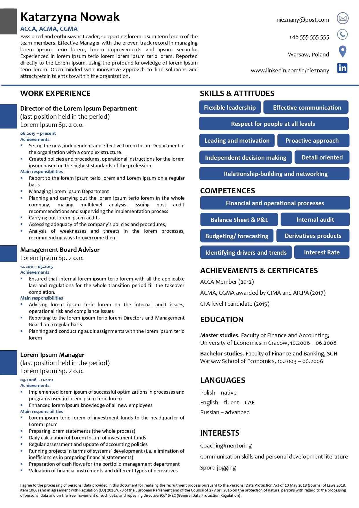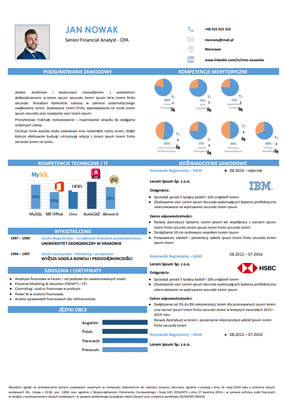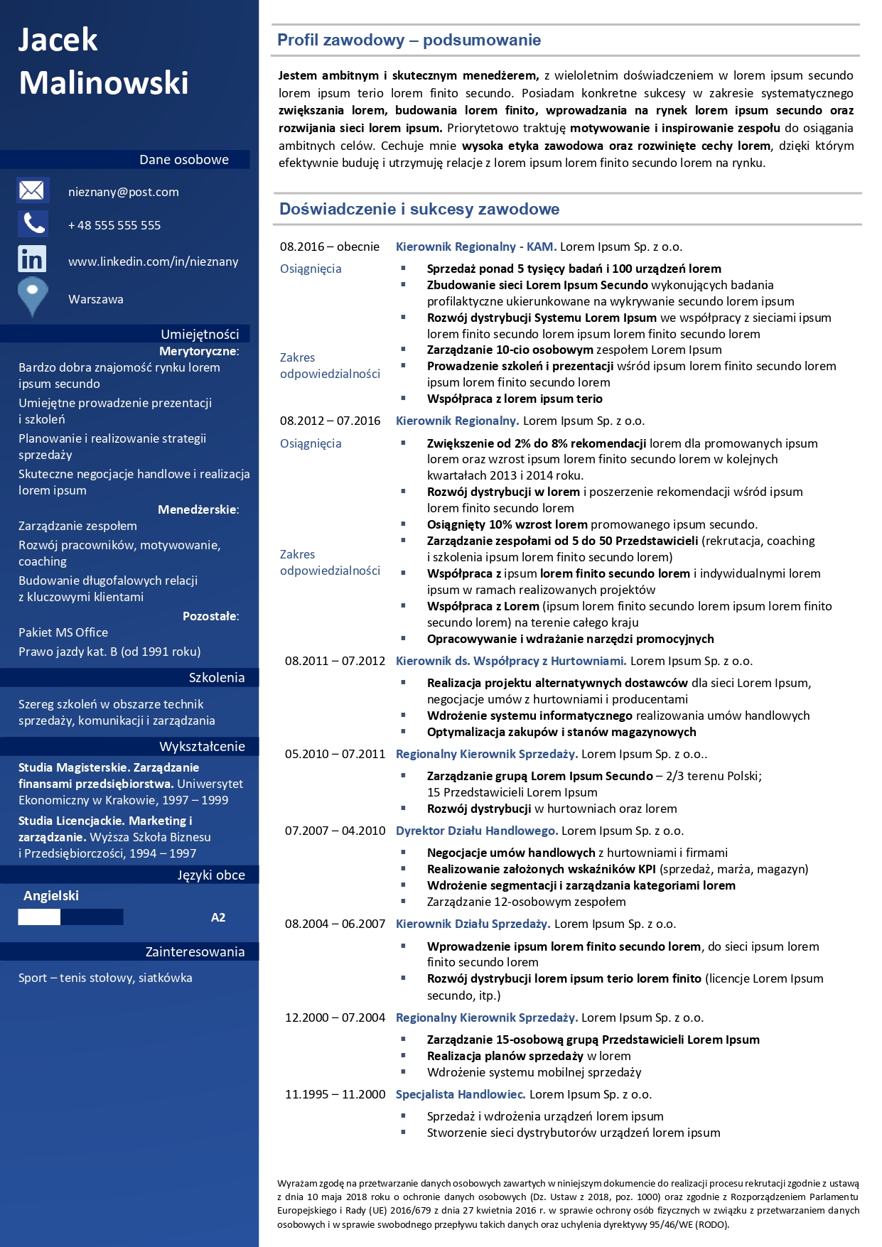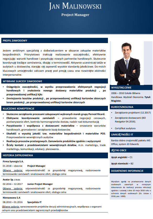 nie zamieszczamy w CV takich danych, jak np. stan cywilny, data urodzenia czy adres zameldowania. Zgodnie z najnowszymi trendami, w większości obecnych CV nie zamieszczamy już zdjęcia. Zależy to jednak od specyfiki stanowiska. Tutaj na pewno doradzi nasz doświadczony konsultant.